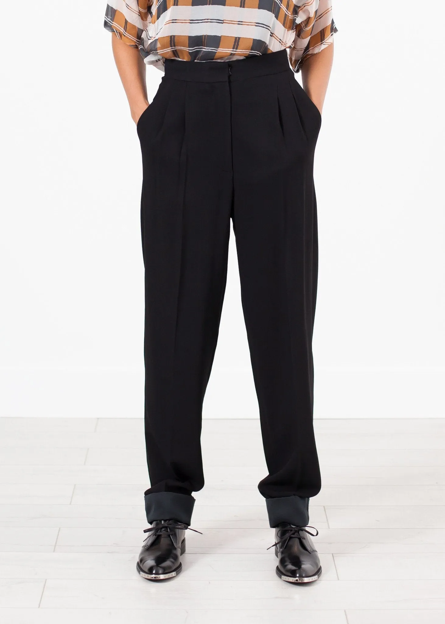 This high waisted silhouette is detailed with front pleats, angled side pockets and faux back pockets for a slim profile. A tapered leg reveals tonal sateen tuxedo-like cuffs. Color Black. 96% Viscose. Lana is wearing a German 38.
